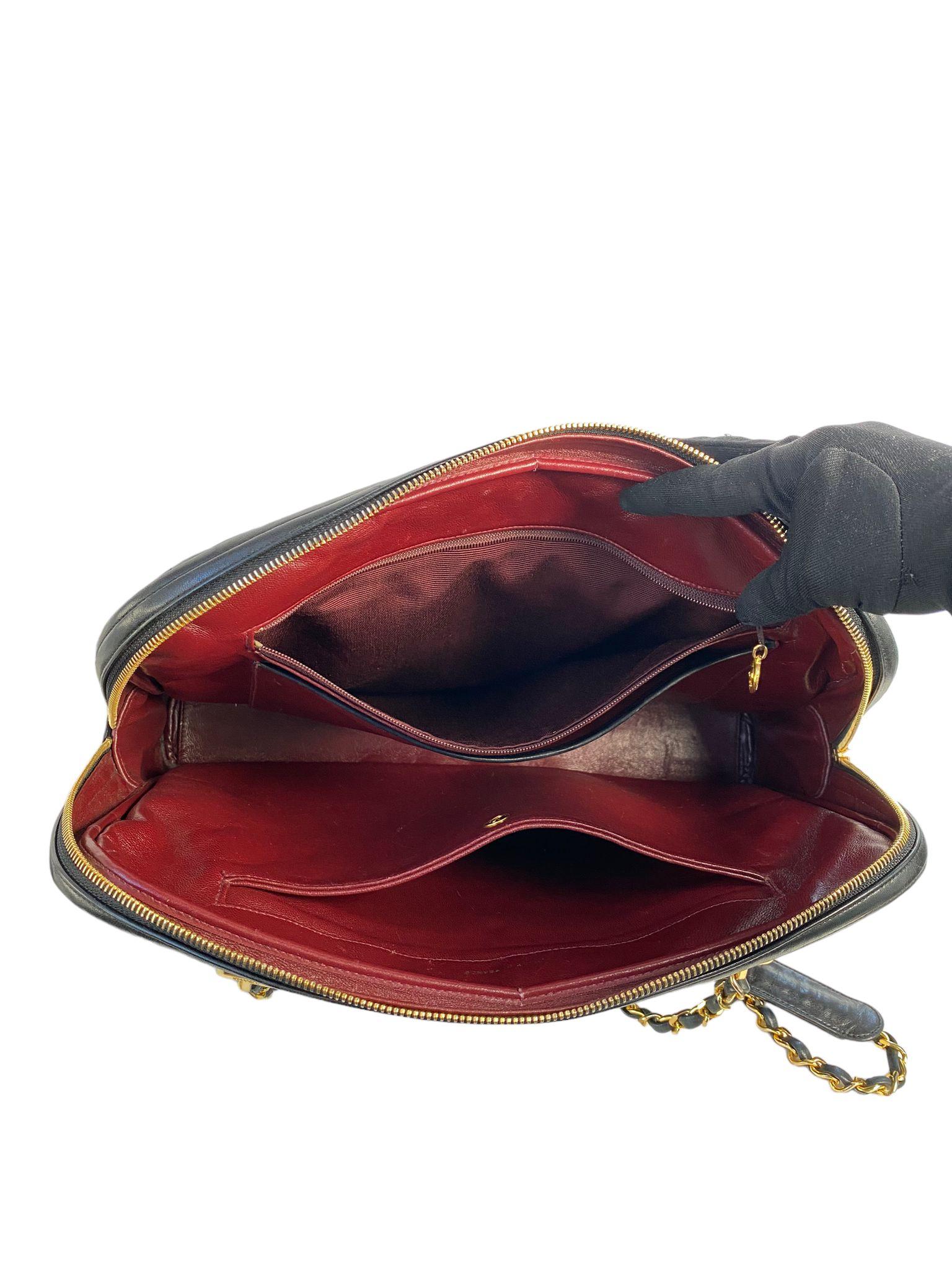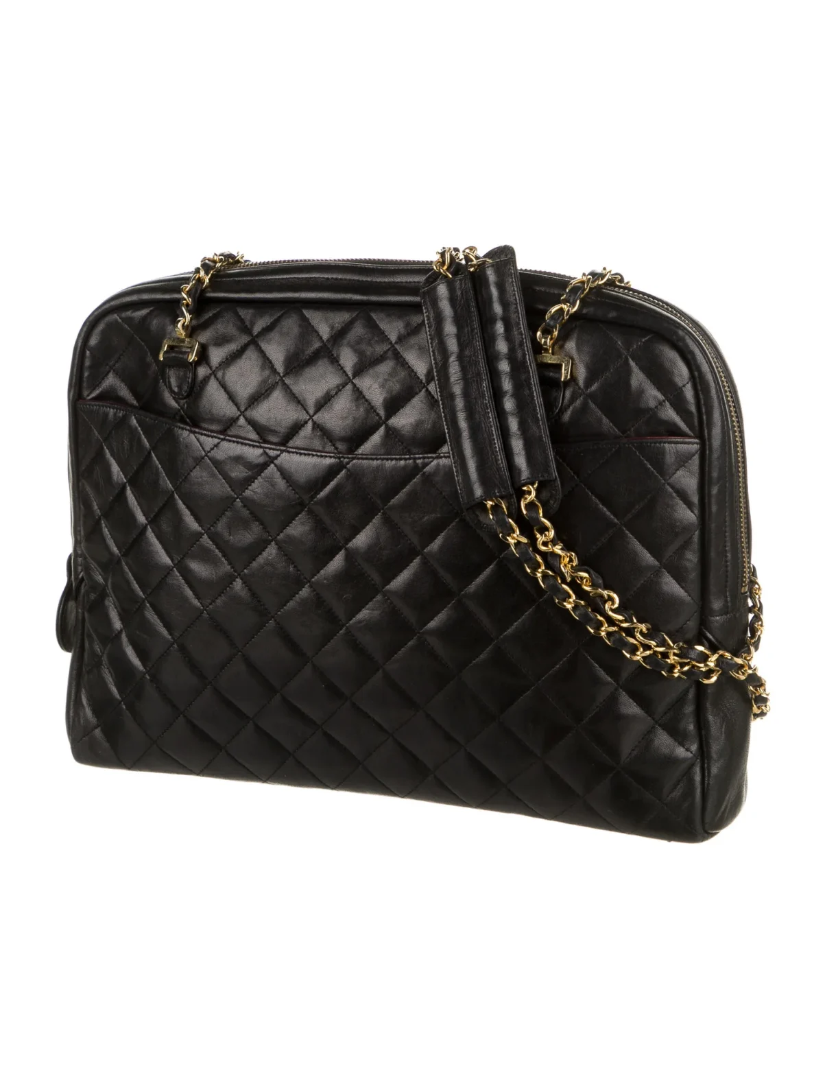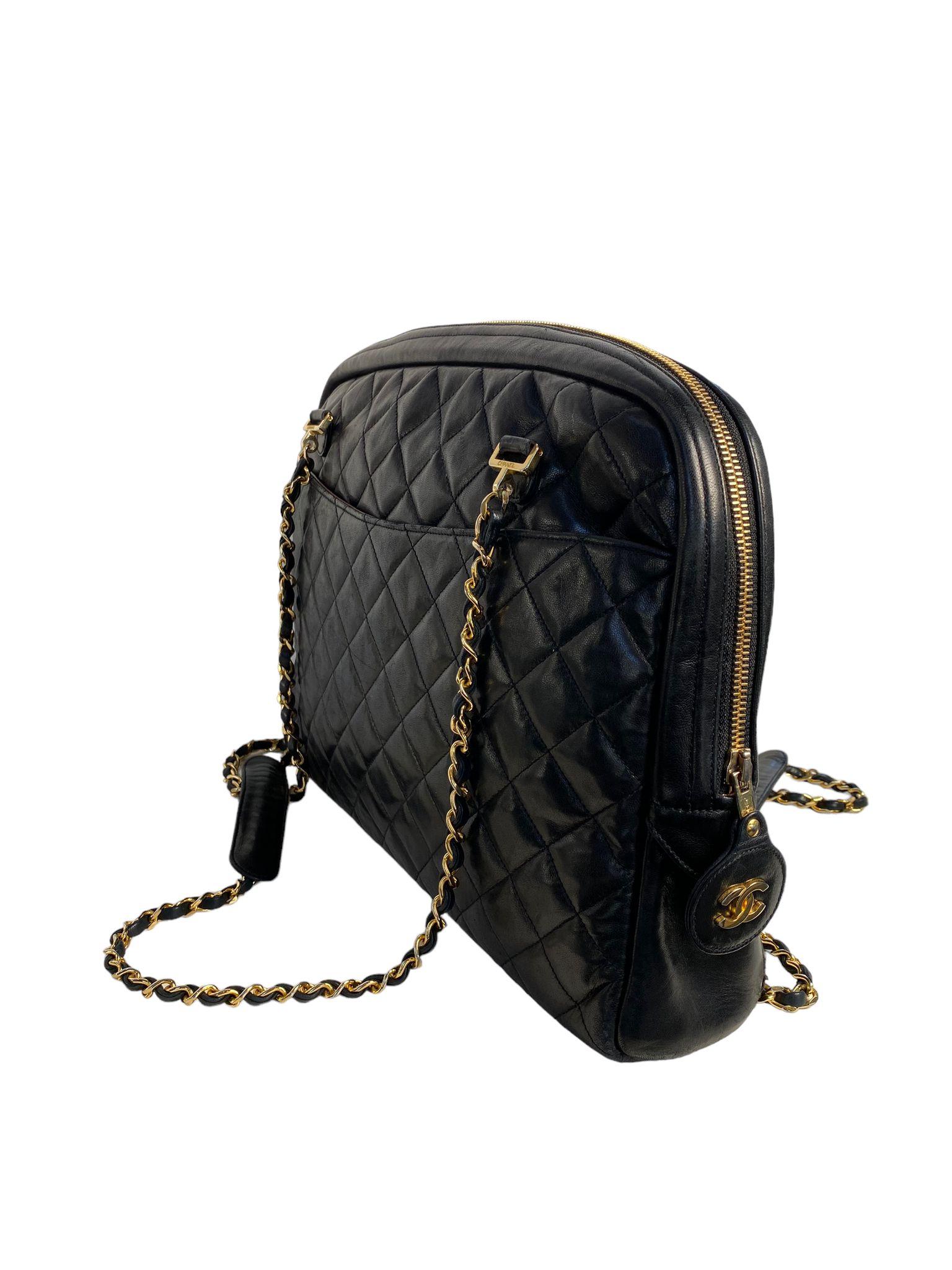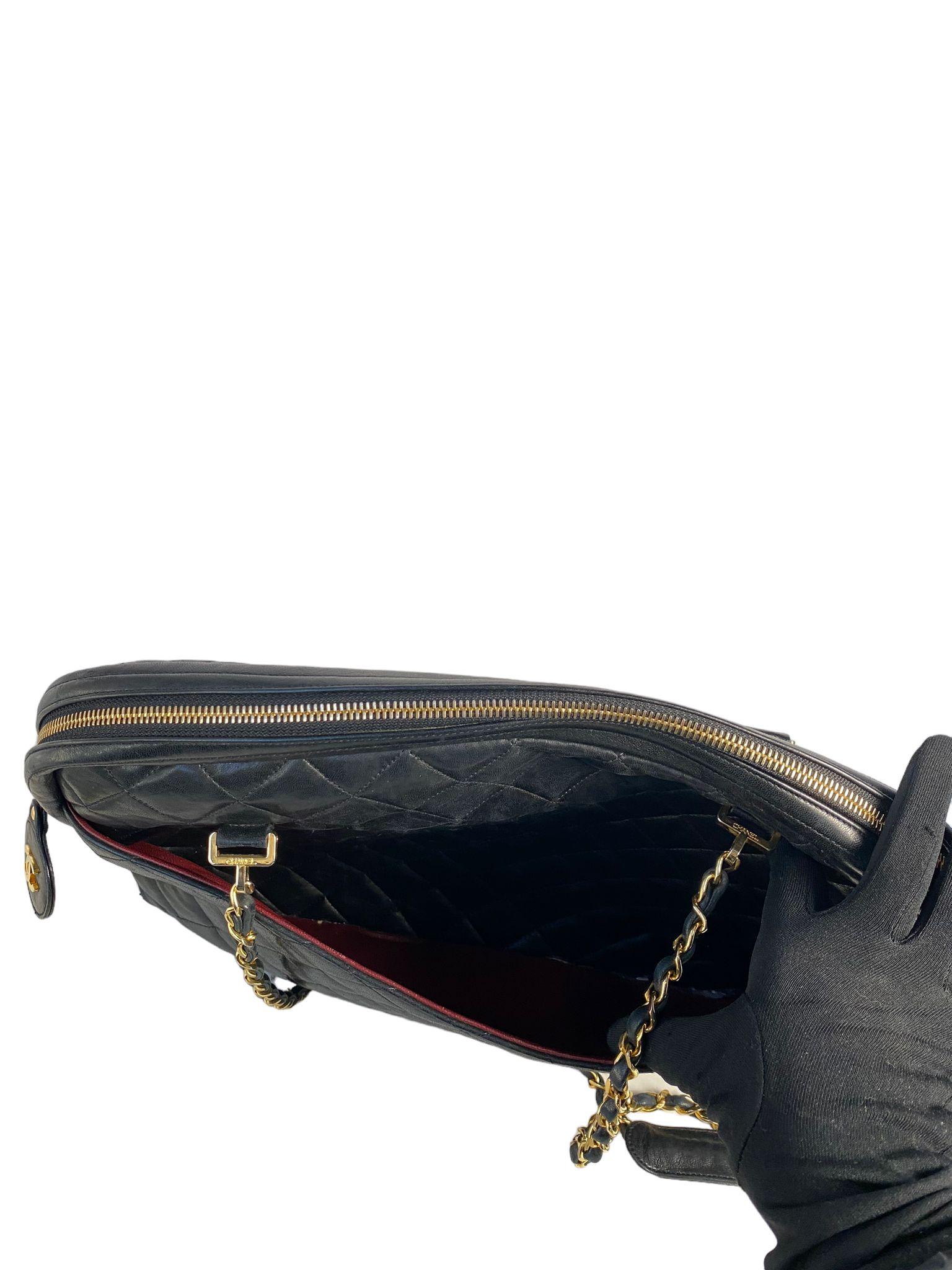 Presenting a large black vintage CHANEL bag with gold tone chain straps.