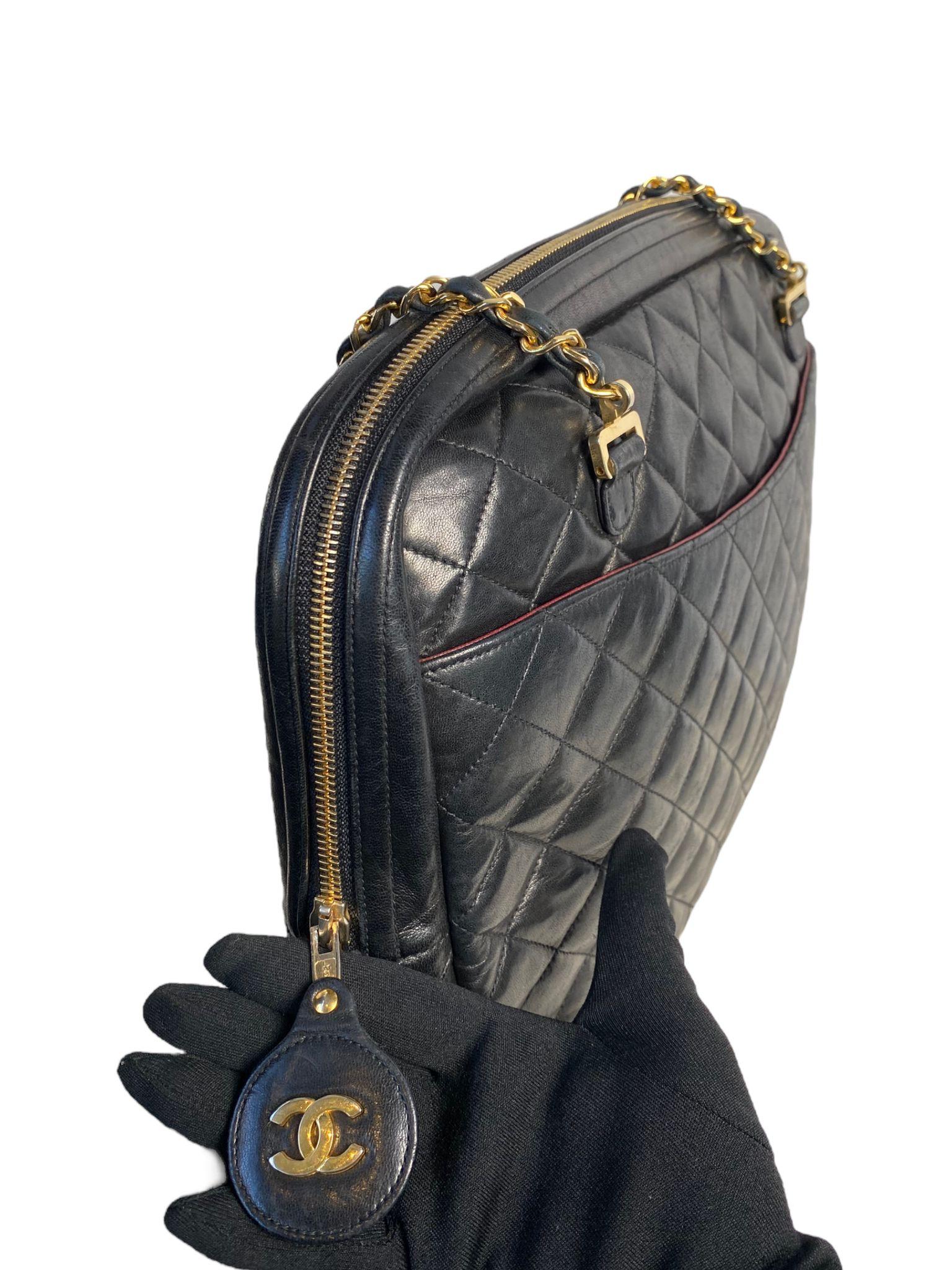 CHANEL vintage large classic black sheepskin bag with double gold chain strap and CC pull charm. Perfect daily bag