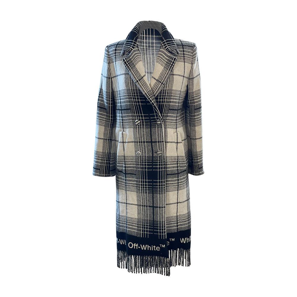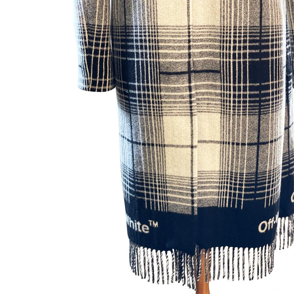 This is a limited edition coat by Off White designed by Virgil Abloh. Made from wool and super soft to the touch in a black and white checkered pattern with a tassels to the bottom coat.