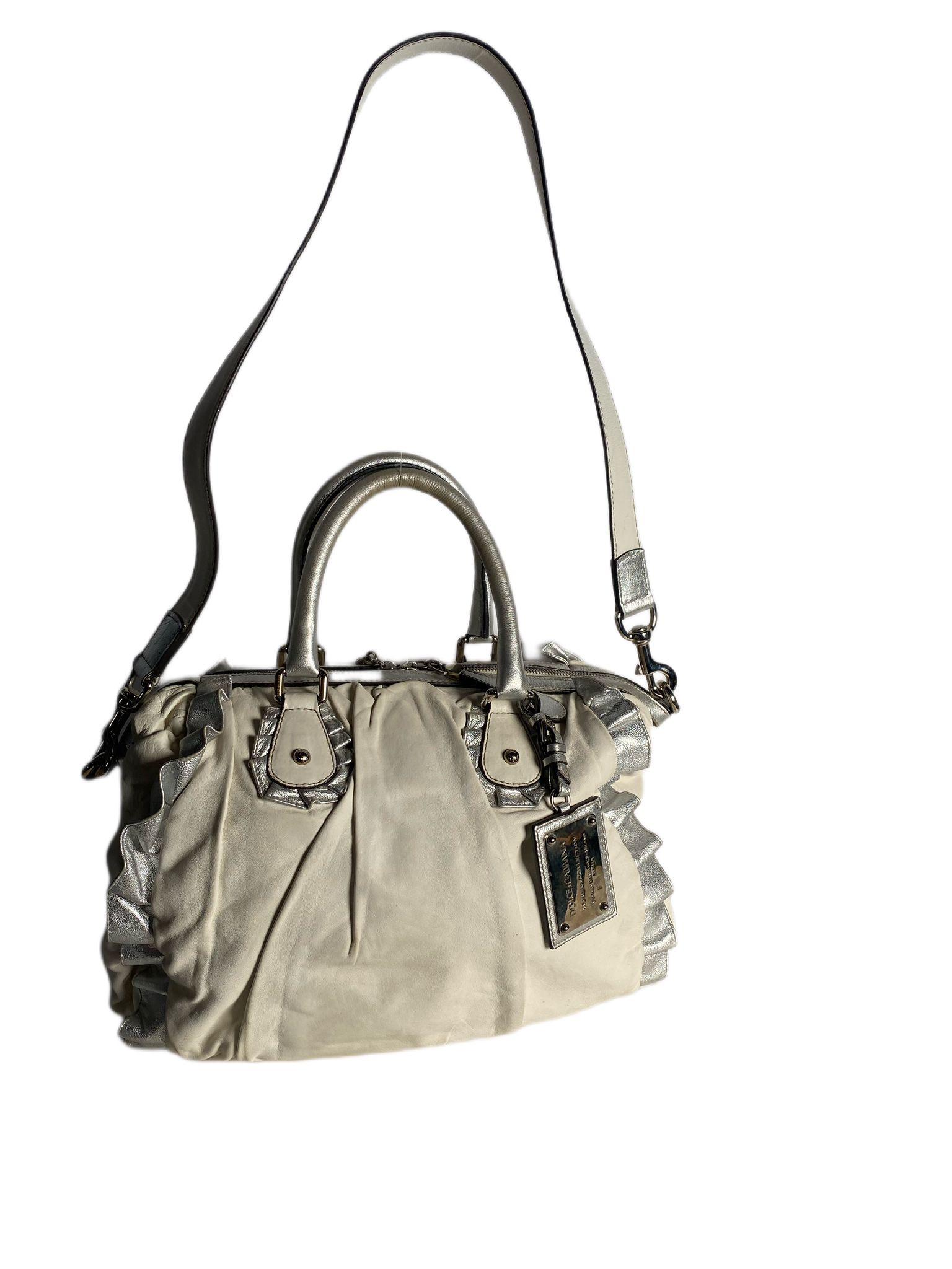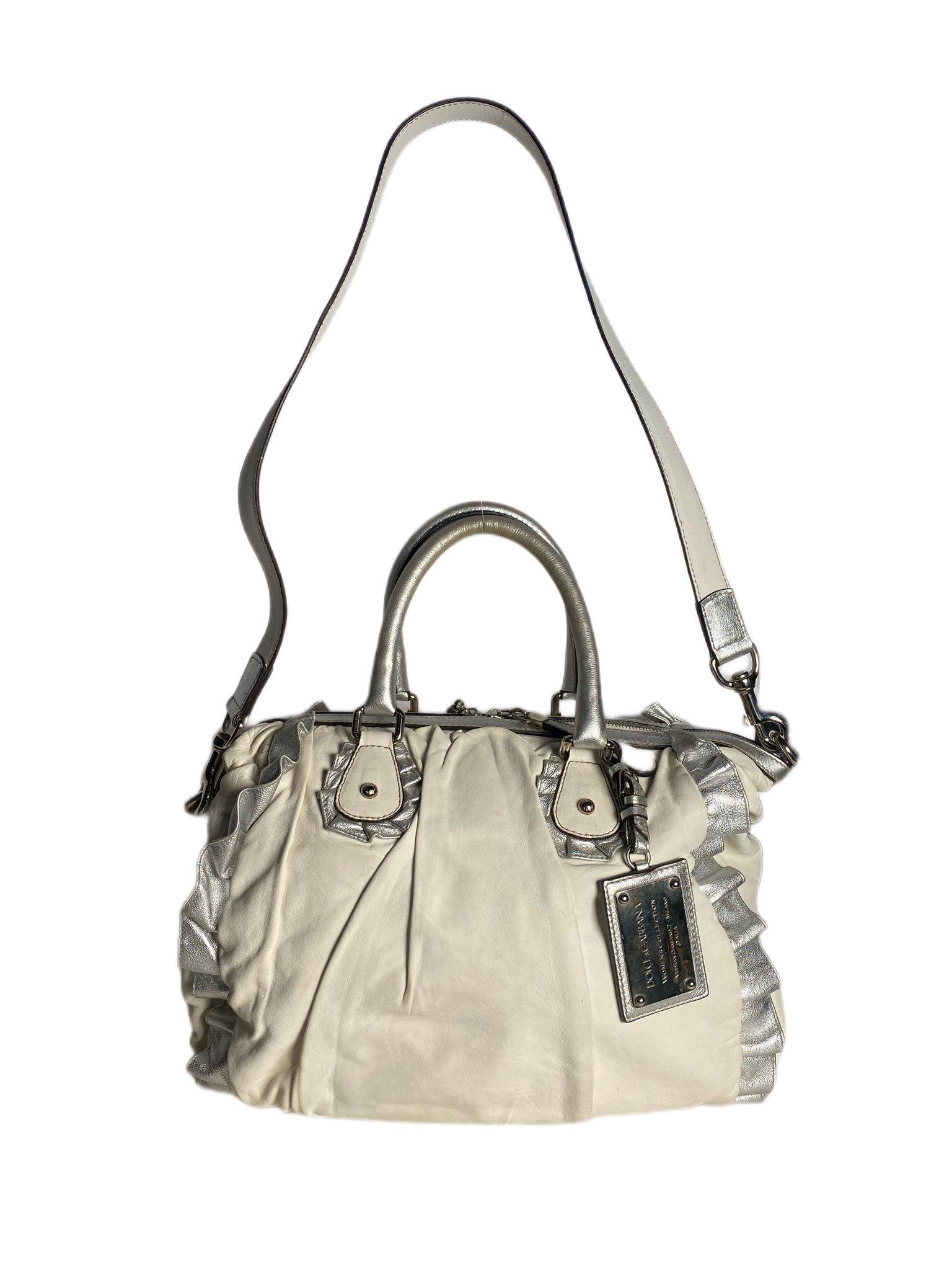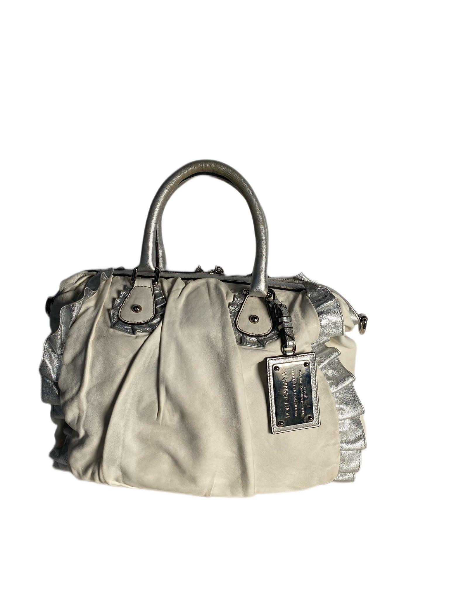 DOLCE & GABBANA Distressed Calfskin Ruffled Miss Rouche Satchel White Silver