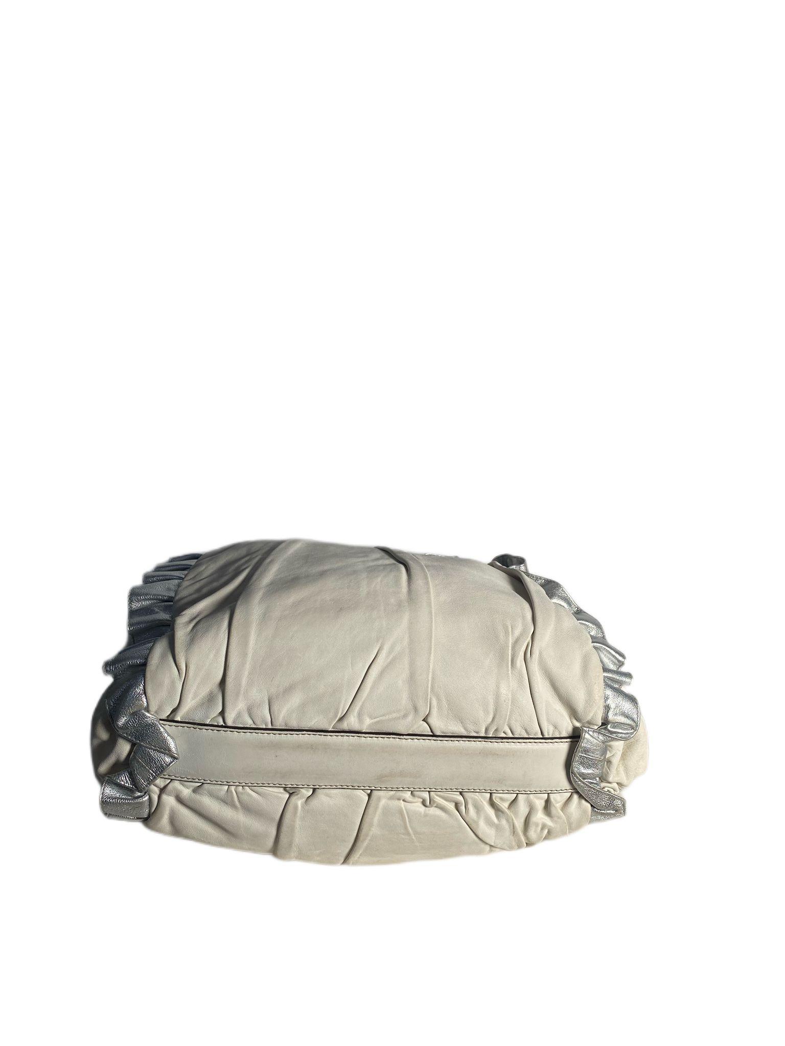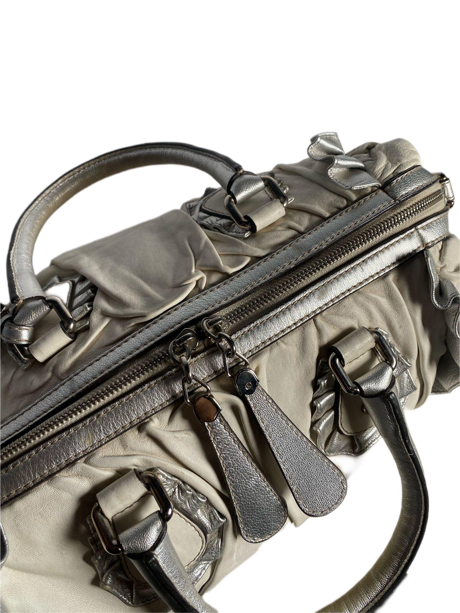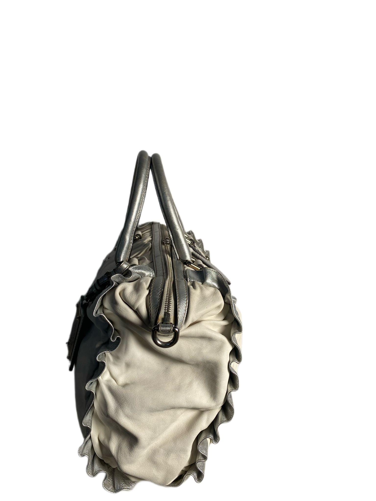This is an authentic DOLCE & GABBANA Distressed Calfskin Ruffled Miss Rouche Satchel in White and Silver. This bag is crafted of calfskin leather in white and silver. It features silver ruched accents throughout the exterior of the bag, silver top handles and an optional leather shoulder strap. The top zippers open to a metallic leather interior with a zipper and patch pockets.