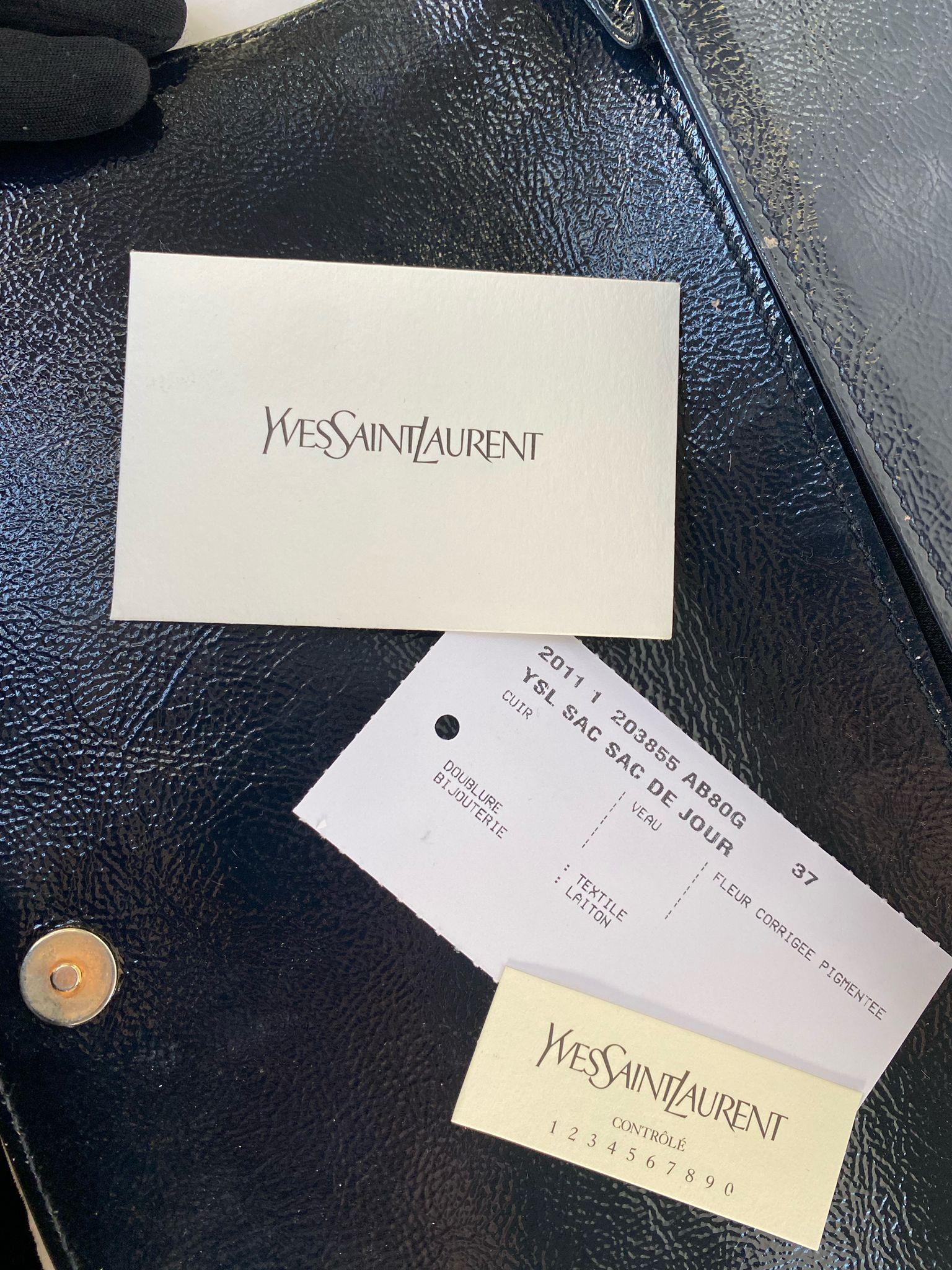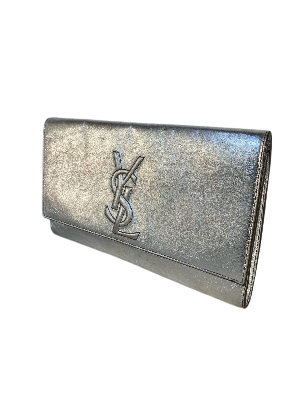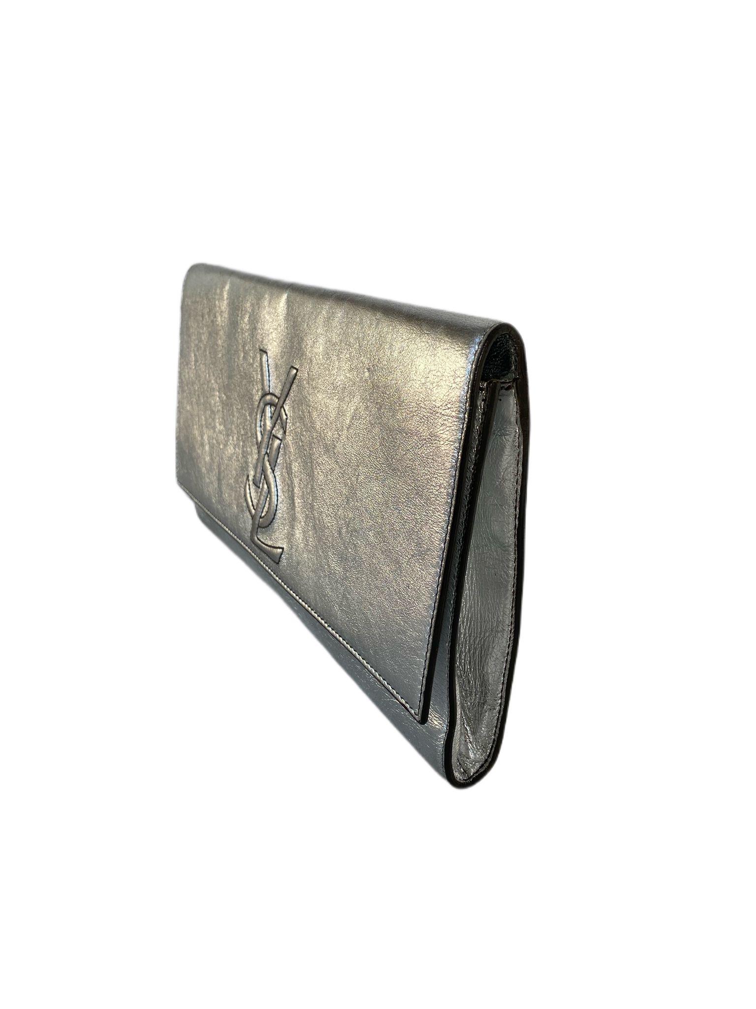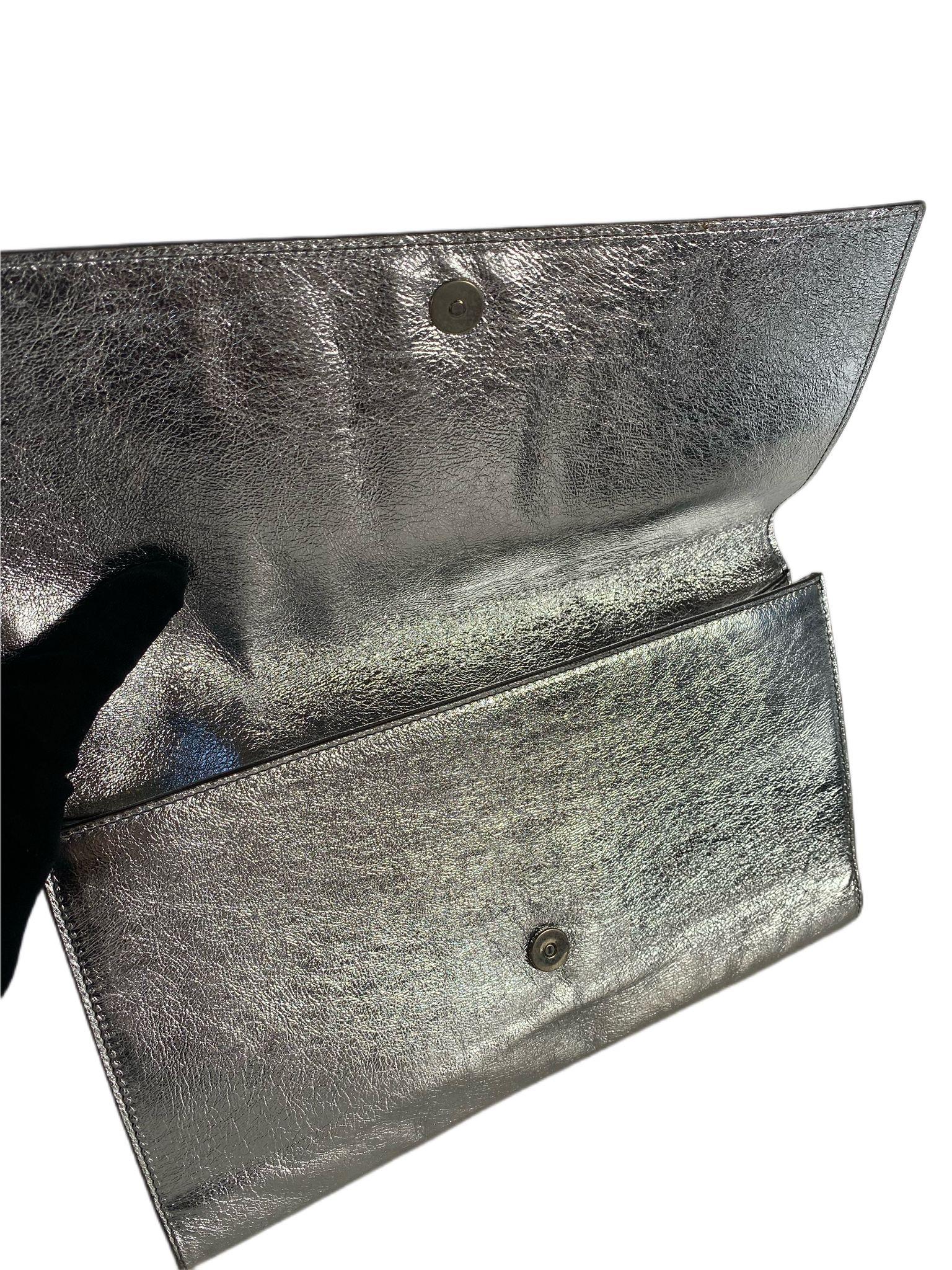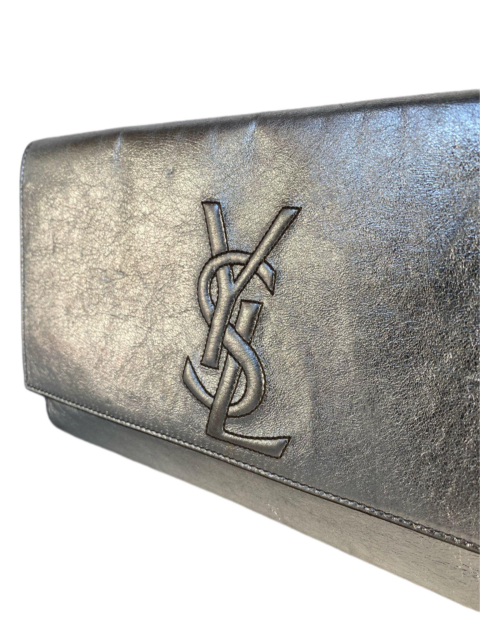 This is an authentic YSL YVES SAINT LAURENT Metallic Leather Large Belle De Jour Clutch in Silver-New. This clutch is crafted of textured metallic silver leather. The front flap features a classic stitched YSL monogram logo patch and reveals a black satin fabric interior with a flat pocket. This clutch handbag from Yves Saint Laurent is perfect for day or evening.