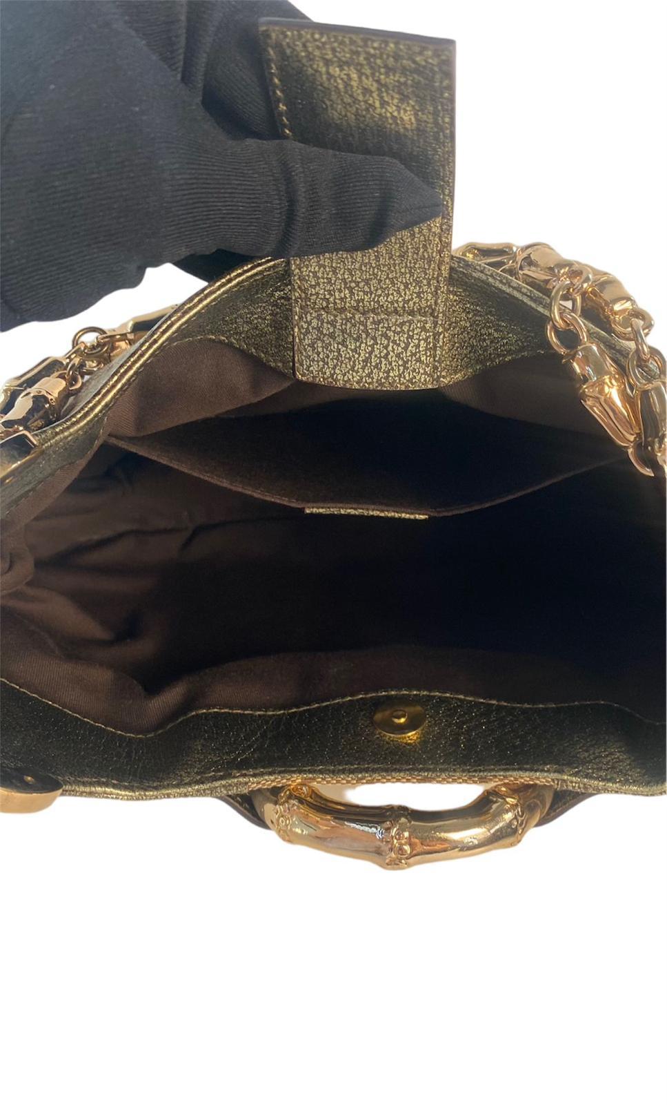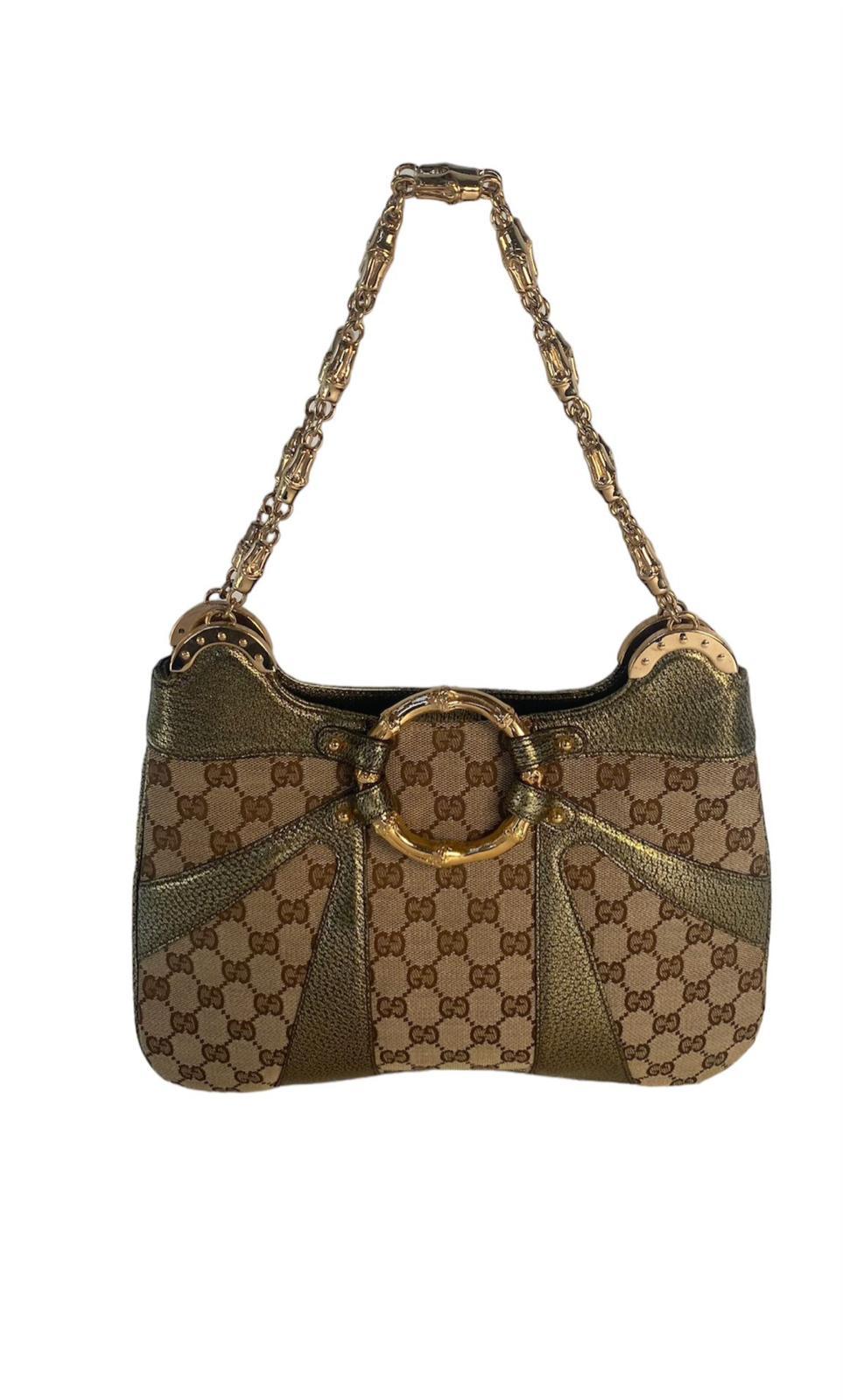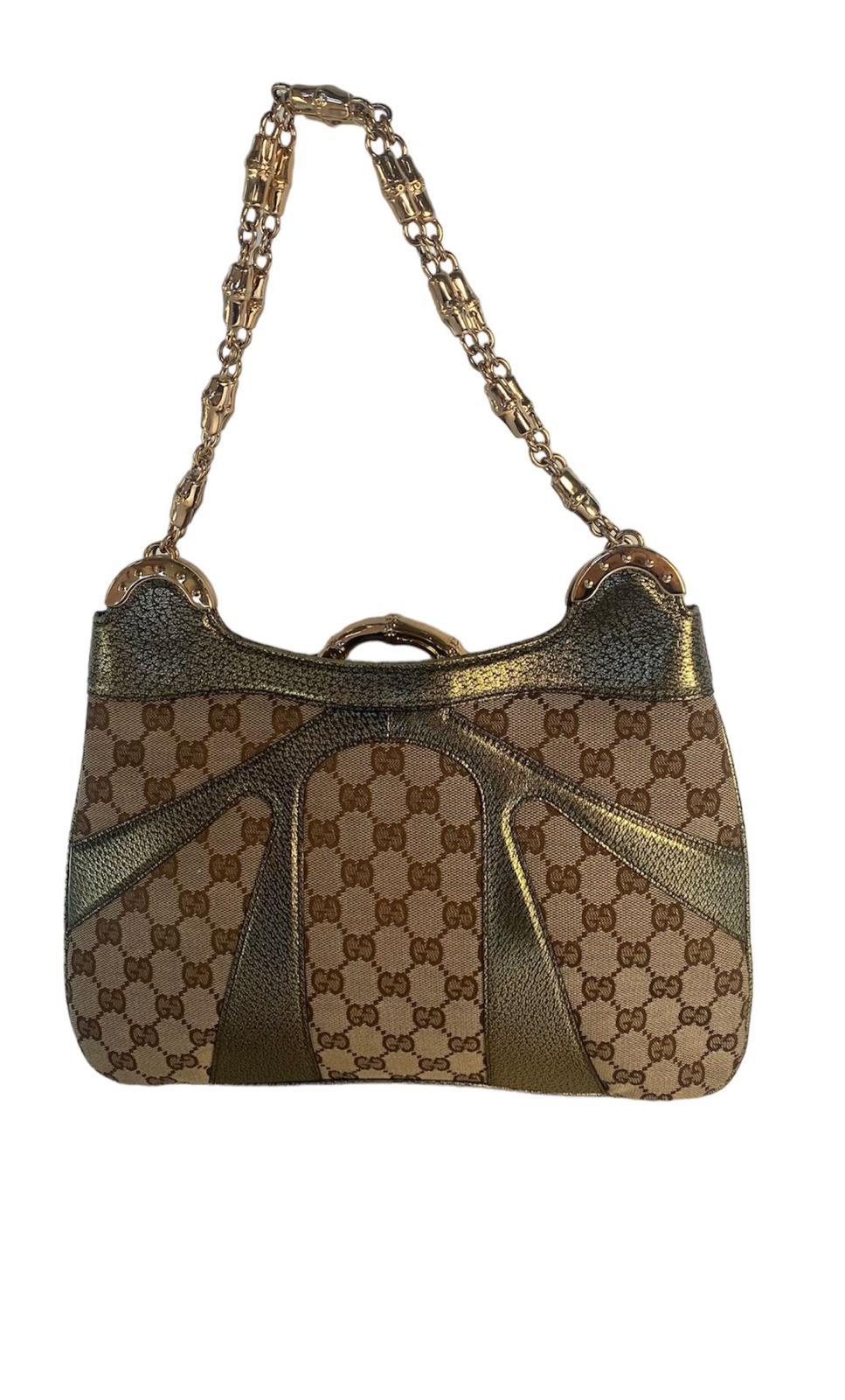 This is an authentic GUCCI Monogram Bamboo Chain Tom Ford Shoulder Bag in Metallic. This chic tote is crafted of classic Gucci GG canvas with decorative metallic central leather detailing. The bag features gold bamboo shaped link shoulder straps and a large bamboo style gold hoop where all of the leather comes together. The top is open to a mocha fabric interior with a flat pocket.