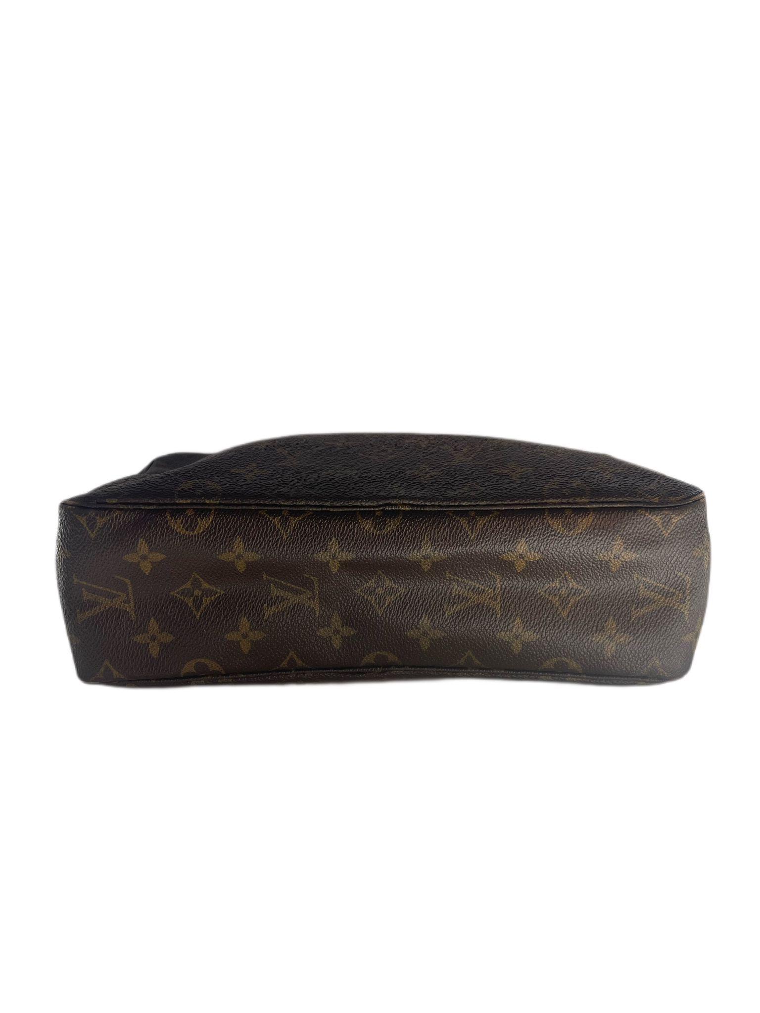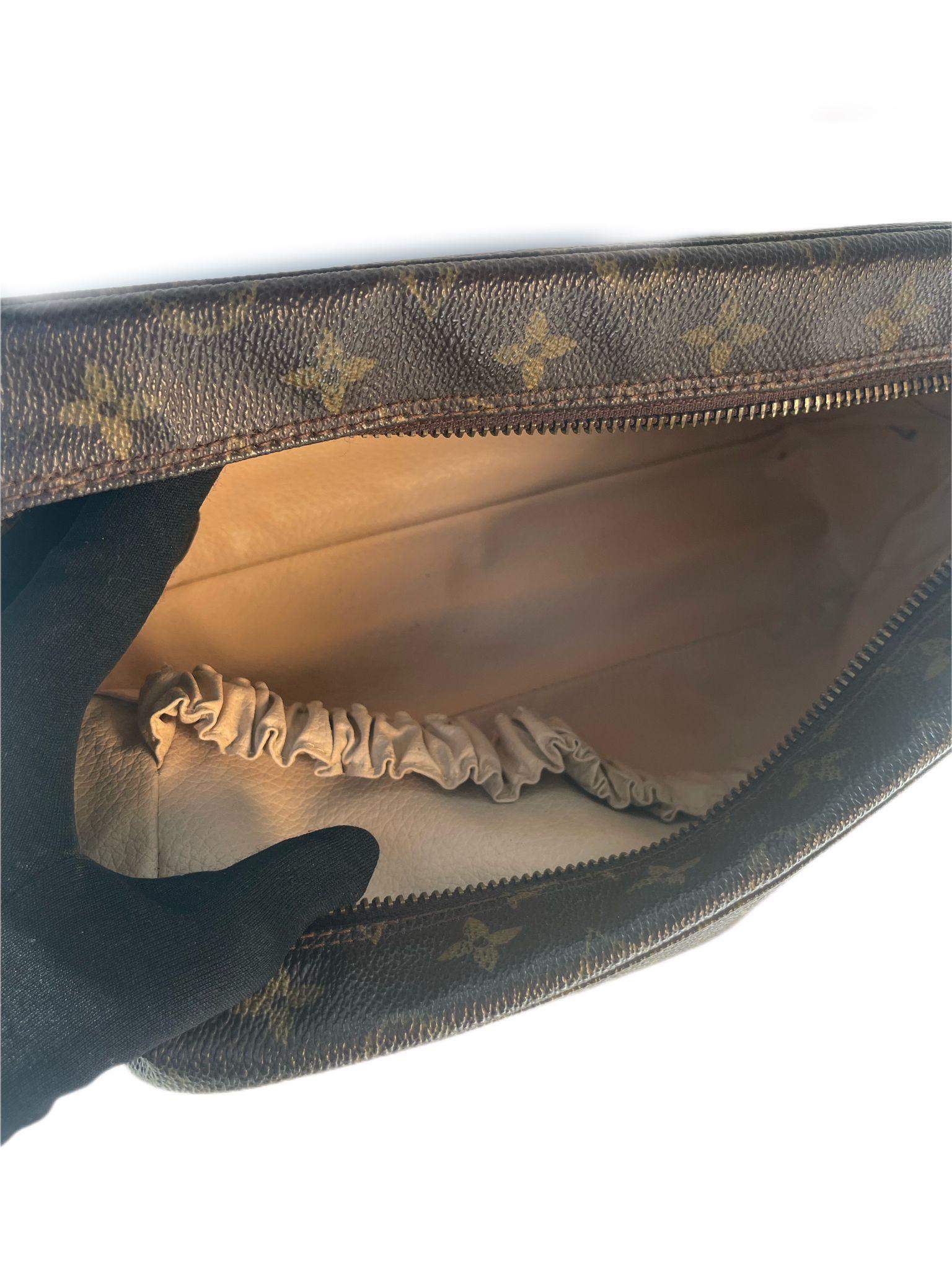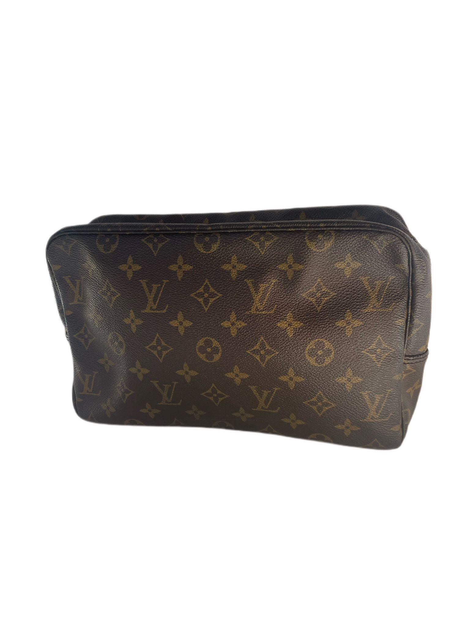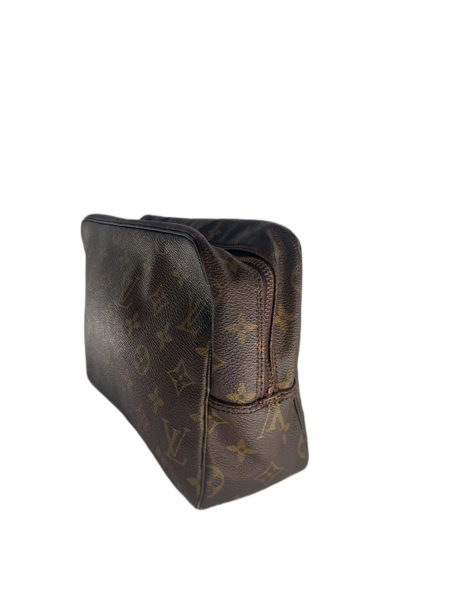This is an authentic LOUIS VUITTON Monogram Trousse Toilette 28 This travel pouch is crafted of signature Louis Vuitton monogram on toile canvas. This pouch features a brass zipper that leads to a beige leather like interior features a patch pocket and elastic holders for cosmetic bottles.