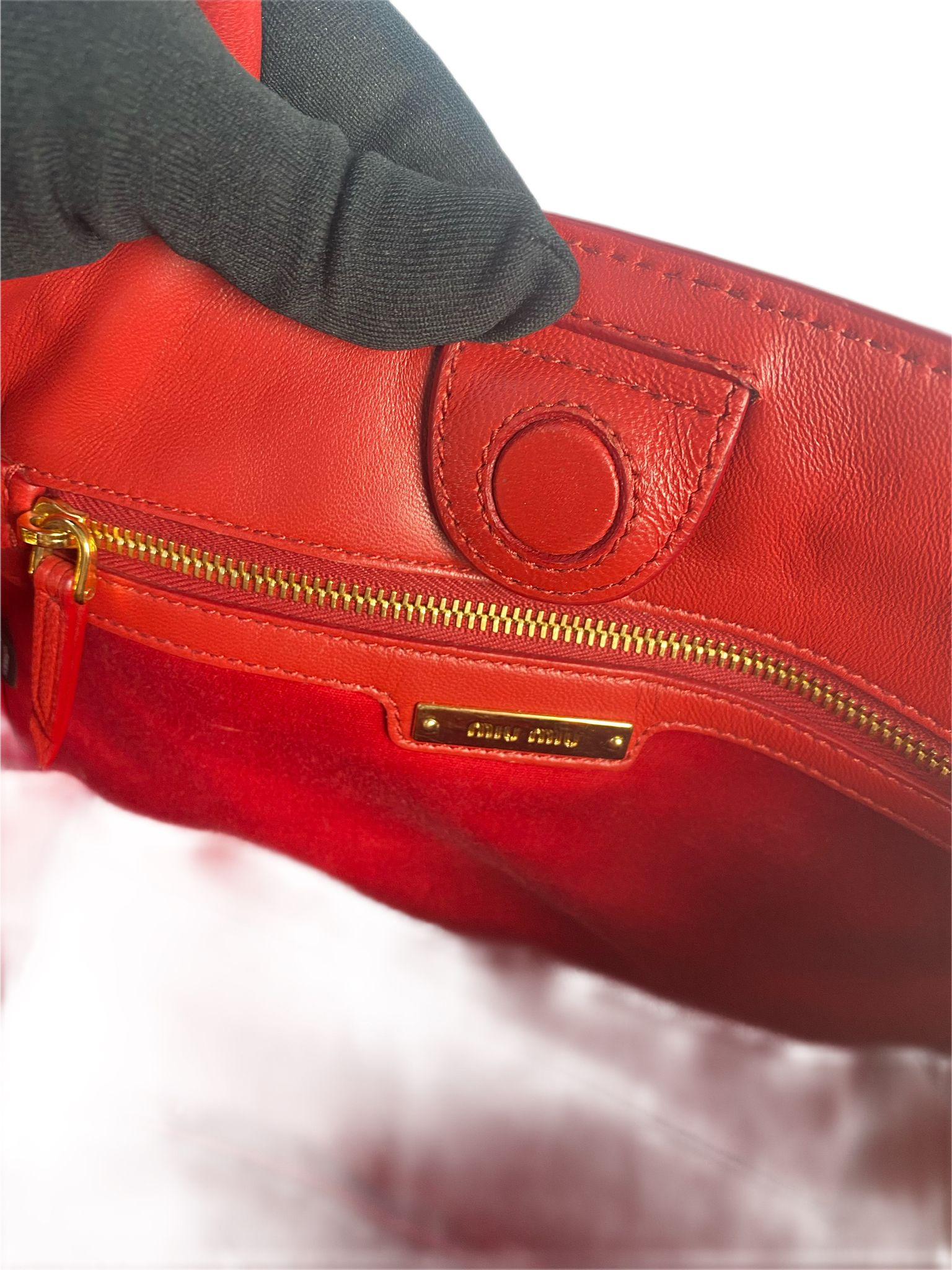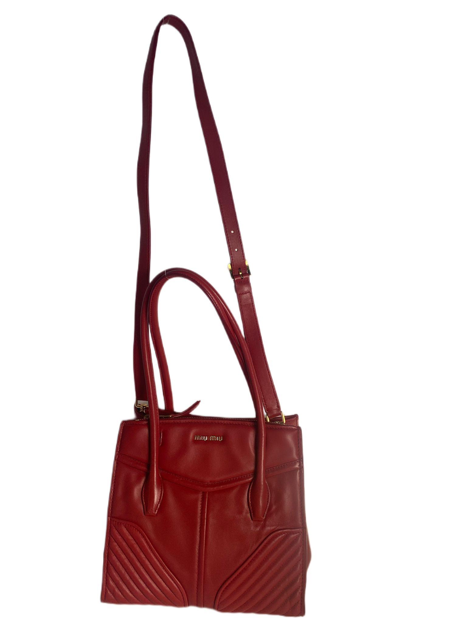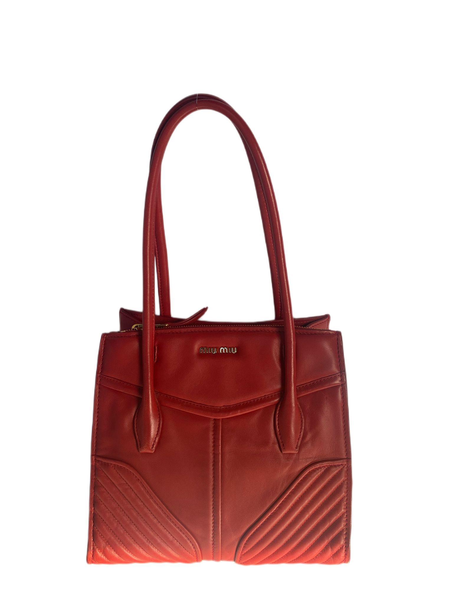 This is an authentic MIU MIU Nappa Matelasse Biker Tote in Fuoco. This stylish tote is crafted of red leather. The bag features rolled leather top handles with an optional shoulder strap detailed with polished gold hardware and expansive wings. This unique handbag opens to a red fabric interior with zipper and patch pockets. This is an excellent tote for day or evening, from Miu Miu!