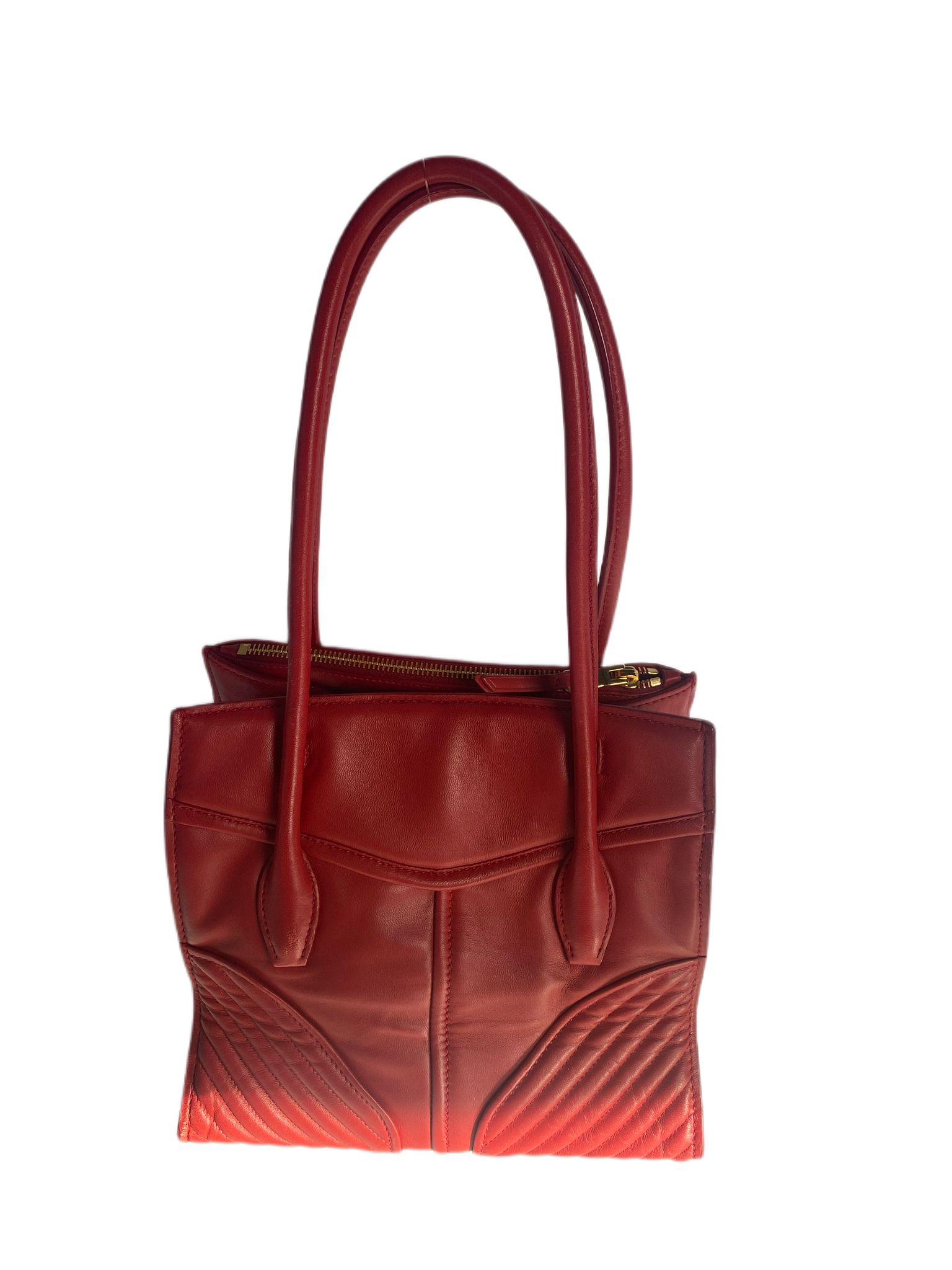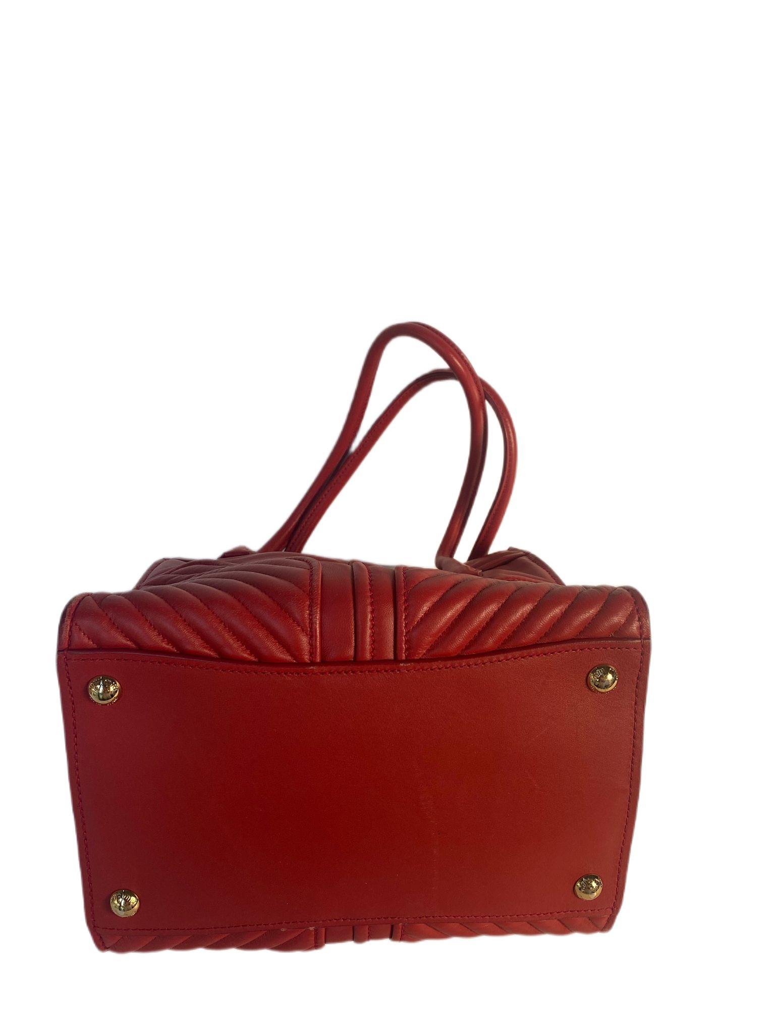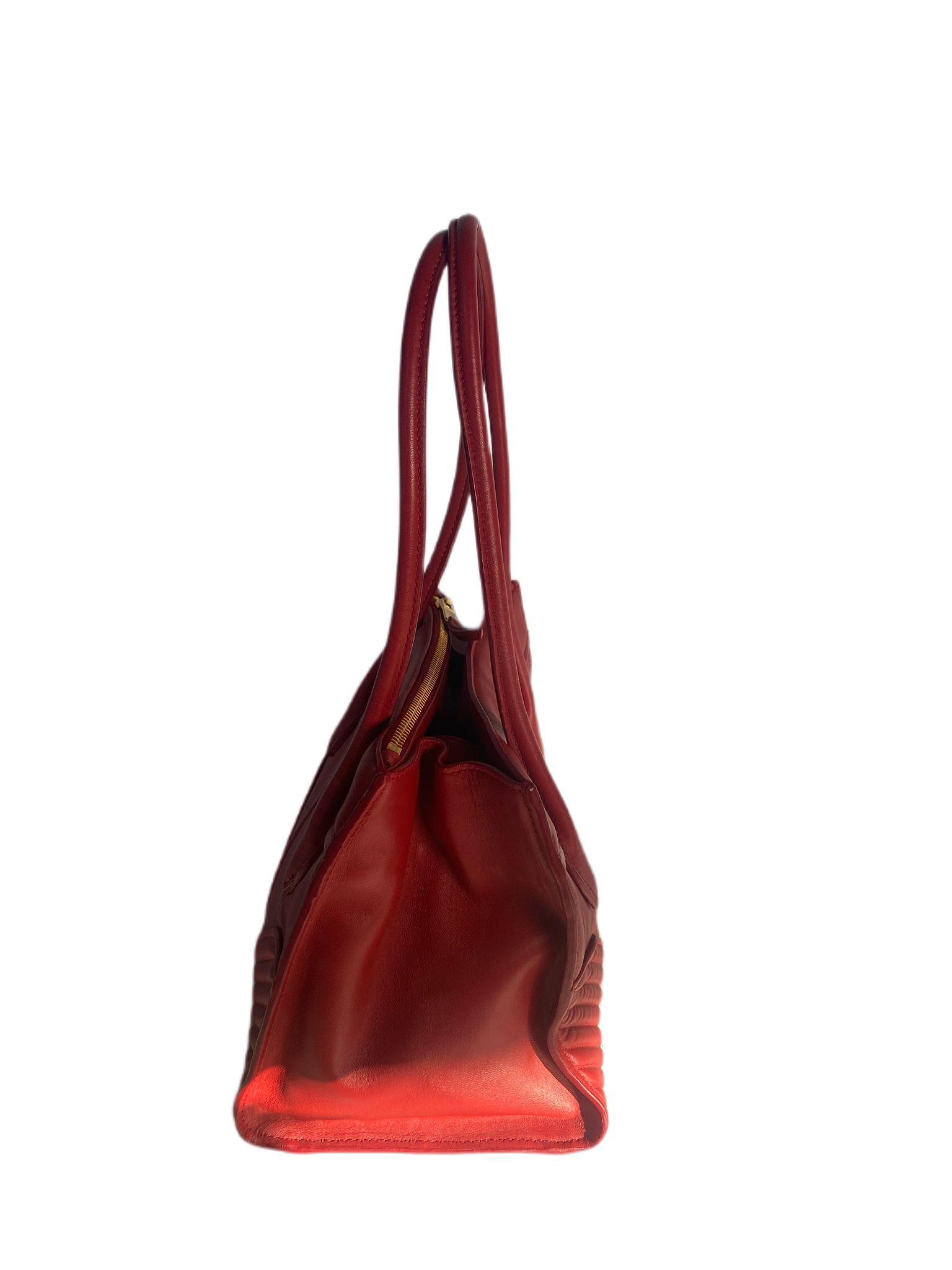 This is an authentic MIU MIU Nappa Matelasse Biker Tote in Fuoco. This stylish tote is crafted of red leather. The bag features rolled leather top handles with an optional shoulder strap detailed with polished gold hardware and expansive wings. This unique handbag opens to a red fabric interior with zipper and patch pockets. This is an excellent tote for day or evening, from Miu Miu!