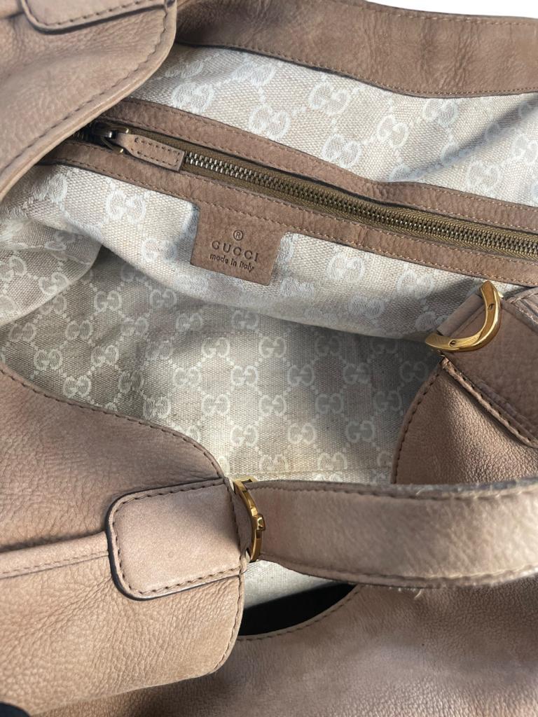 This is an authentic GUCCI Nubuck Large Soft Stirrup Shoulder Bag in Light Brown. This stylish shoulder bag is crafted of velvety soft nubuck calfskin leather. The bag features pebbled sides, looping leather shoulder straps, and a cross over strap closure with polished brass hardware links in a stirrup shape. This opens to a beige Gucci GG monogram fabric interior with zipper and patch pockets, room enough for all of your everyday necessities with the stylish sophistication only from Gucci!
