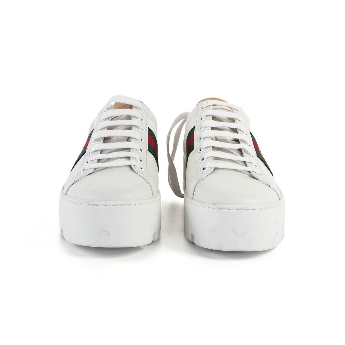 A signature staple from Gucci. White platform leather sneaker with famous two tone stipes on the side and with a golden bee on top