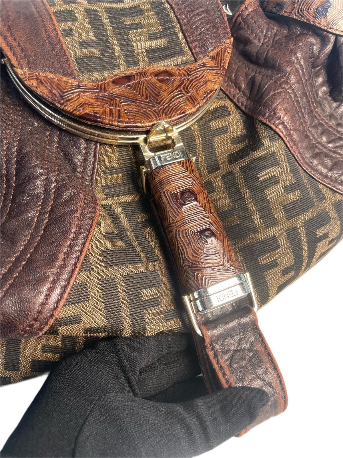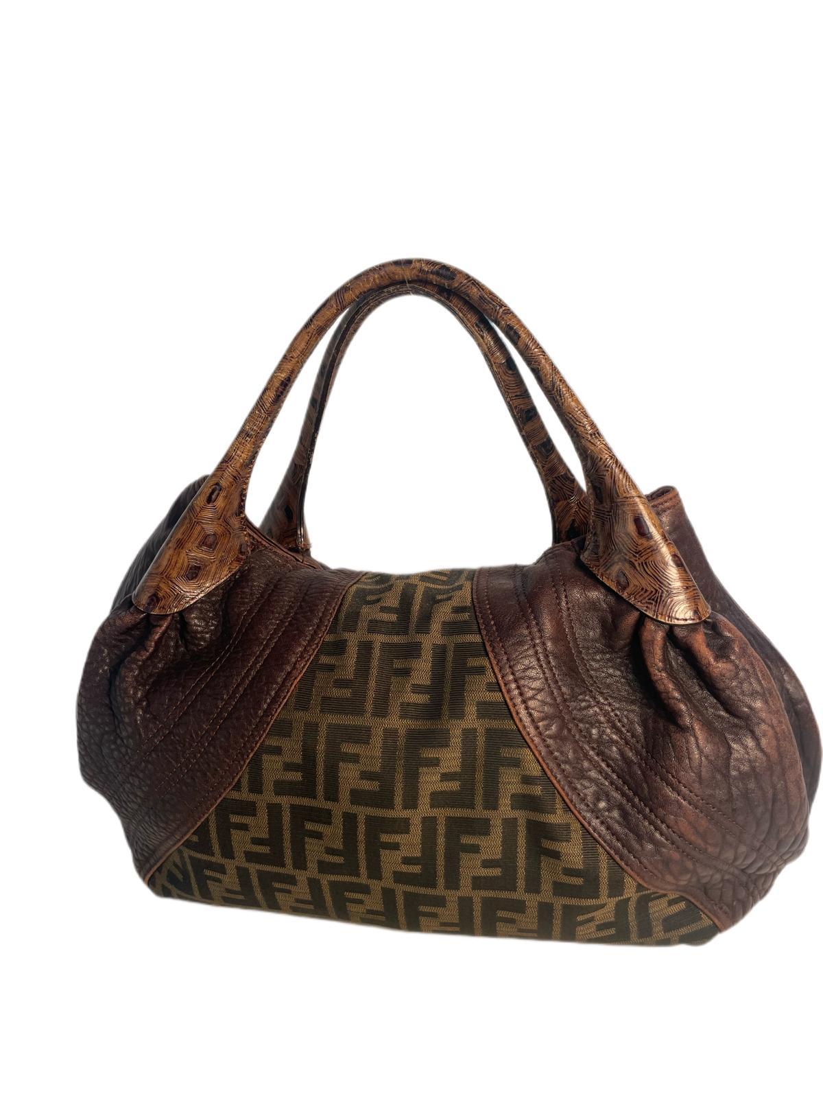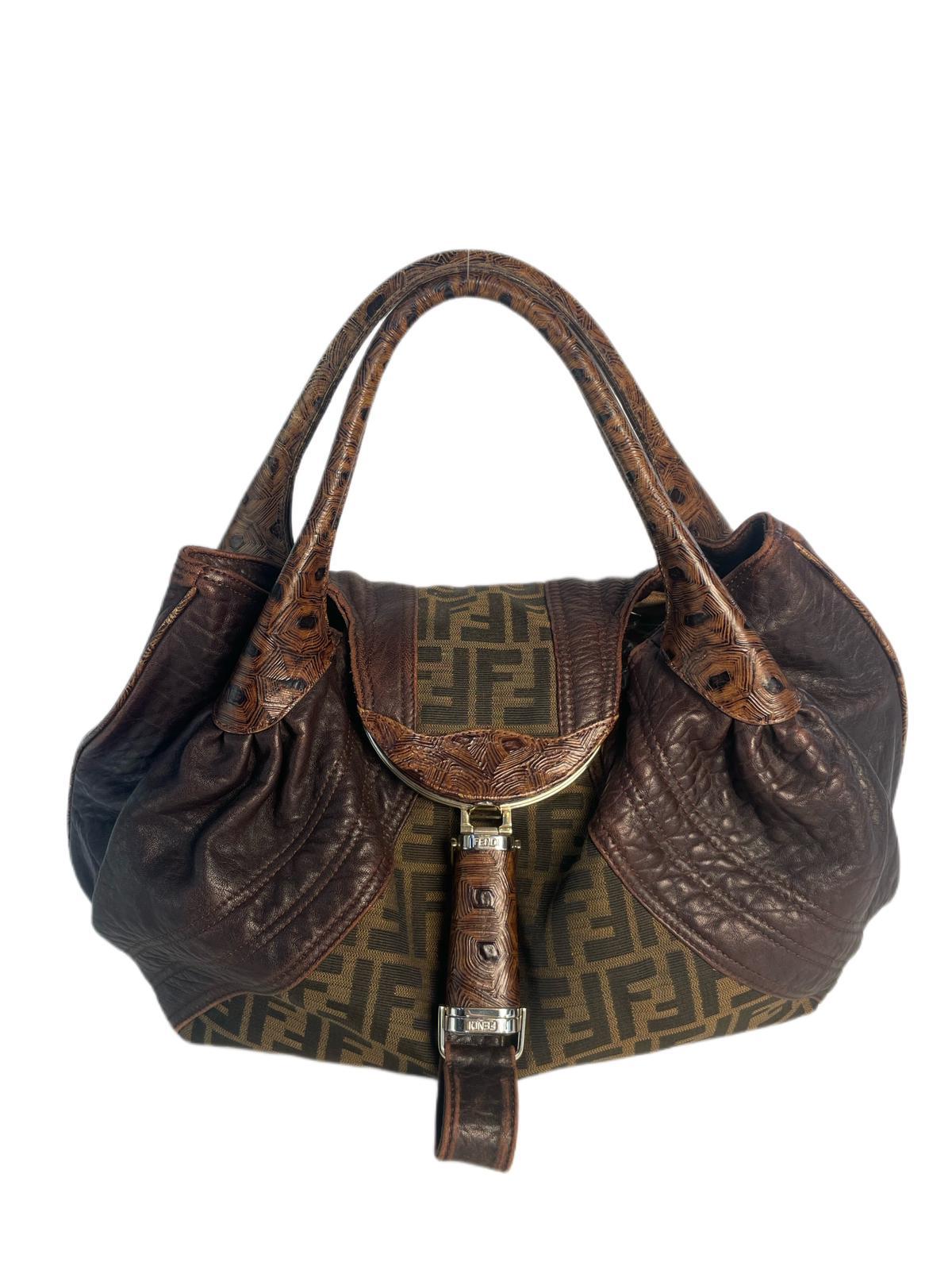 This is an authentic FENDI Zucca Nappa Tortoise Spy in Tobacco. This chic bag is crafted of soft nappa dark brown calfskin leather that has been pleated and tailored with Fendi FF Zucca canvas in the center. The bag has gorgeous tortoise colored leather handles that are wider at their base. The bag has a flap opening with a Fendi logo strap, and opens to a linen interior with a flat pocket.